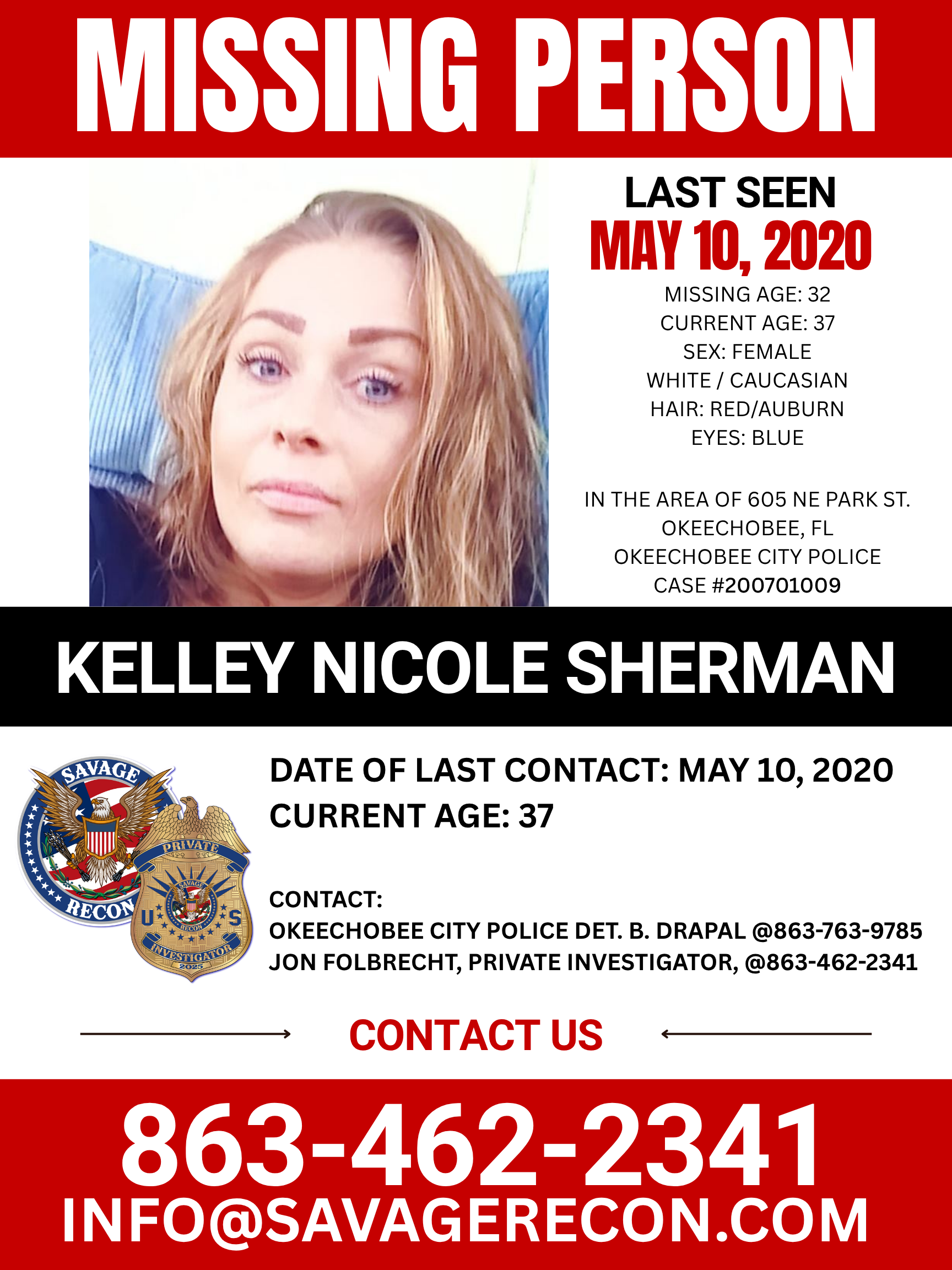 Kelley Nicole Sherman, 37, has been missing since May 10, 2020. Kelley was last seen in the area of 605 NE Park St. Okeechobee, FL 34972. She is a daughter, sister and mother. Her family just wants to bring Kelley home. If you have any information about Kelley’s disappearance, please contact Jon Folbrecht, Private Investigator … Continue reading MISSING: Kelley Nicole Sherman